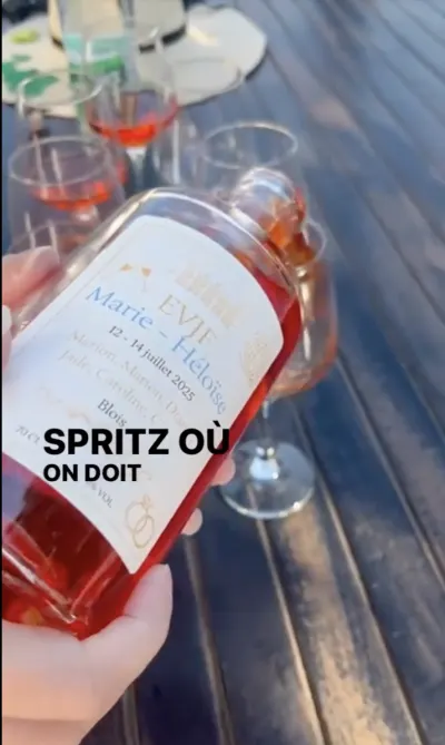 Pour l’EVJF de Marie-Héloïse, ses copines ont achetés toutes leurs bouteilles via Atelier Spirit. 2 bouteilles de Gin Floral Français - Parfait pour des gins tonics 1 bouteille de mélange Spritz qui a permis de réaliser une dizaine de verres 5 bouteilles de vin - rouge, blanc et rosé. Toutes les étiquettes ont été importées et sont des créations originales des témoins. Pour le Gin et le Spirtz la forme de bouteille choisie est La Déterminée avec le bouchon bois d’hêtre.